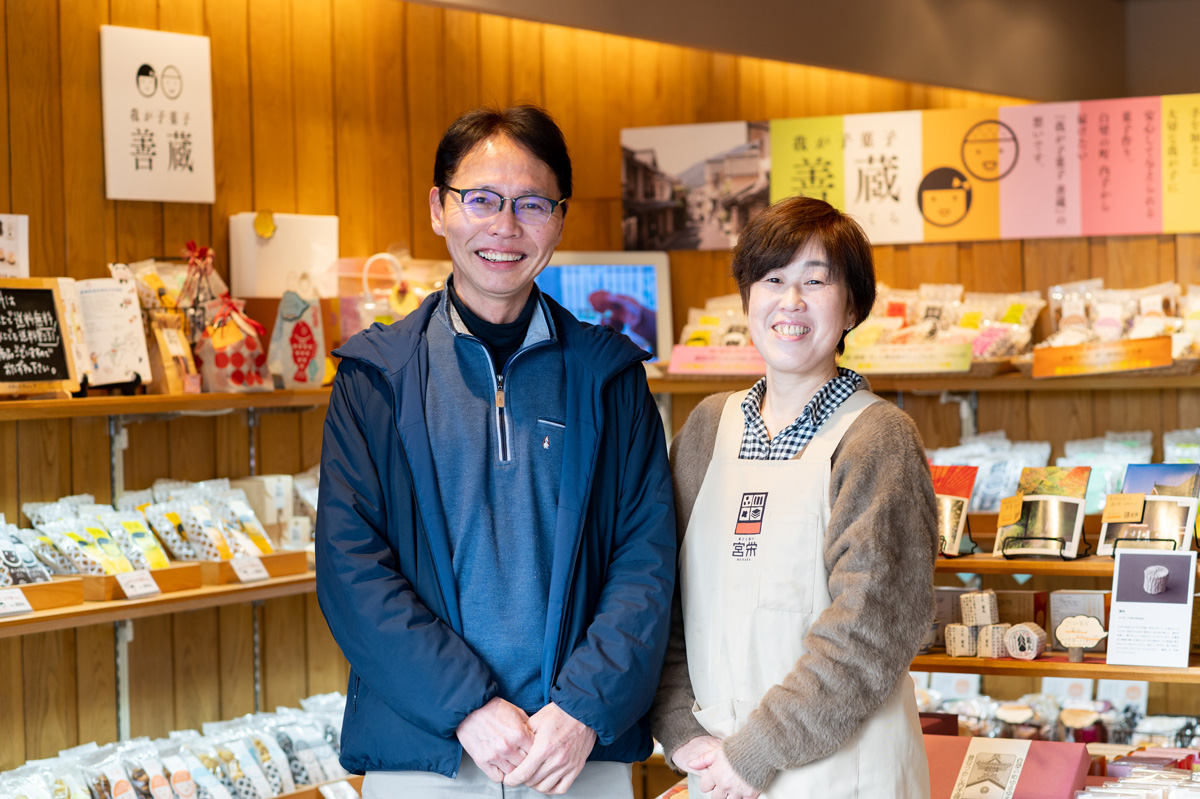笑顔がすてきなご夫妻が営む「菓子と器の宮栄」でおみやげ選び