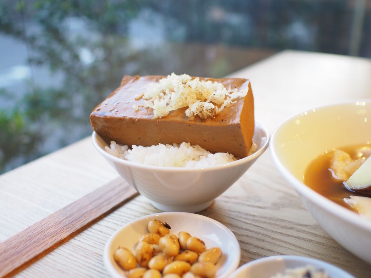 ほかにも新食感の「豆腐のぬか漬け」、食べごたえのある「肉がんも」、ほくっとおいしい「醤油豆」、つるんとなめらか食感の「おぼろ豆腐」、「おから」と、まさに豆腐尽くし! ランチメニューで迷ったら、ぜひこちらの「豆腐御膳」を選んでみて。