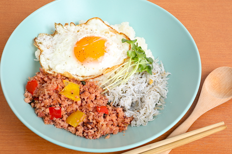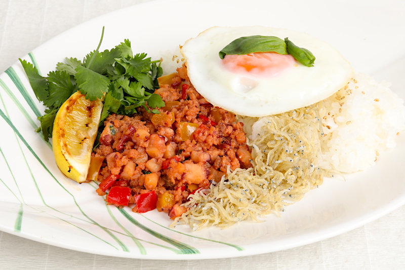 「たことしらすのガパオライス」は、蒸しタコをメインにしたガパオライス。蒸しタコの食感・旨味とシラスの塩気のバランスが良い一品です。