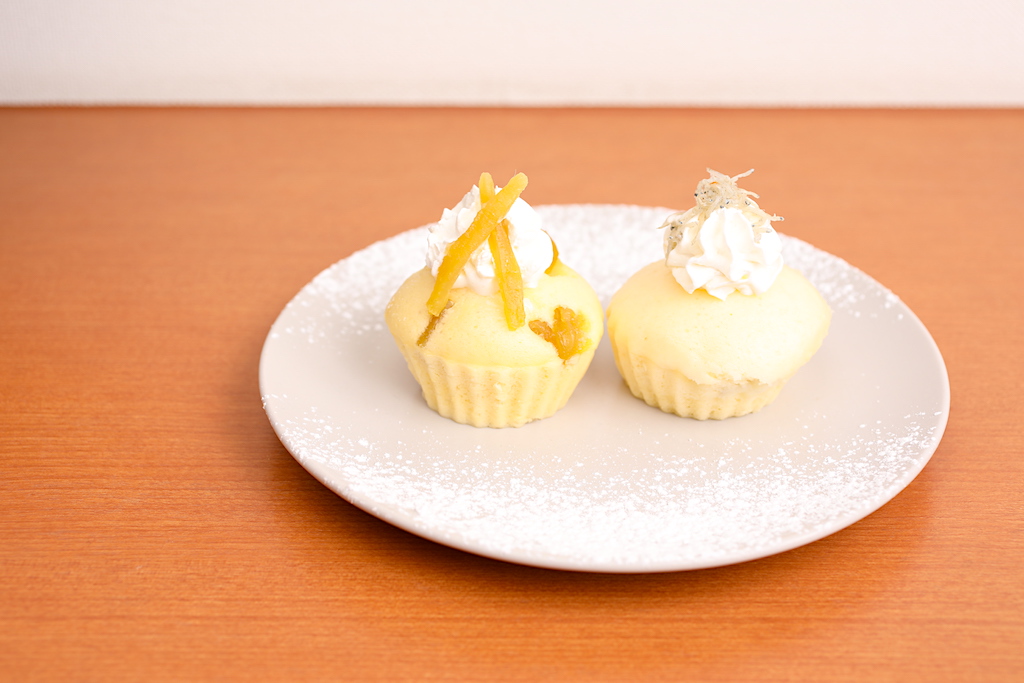 かわいらしいカップパン2個400円。カスタードクリームと干し芋を使ったお菓子感覚のカップパン(左)と、シラスとチーズを加えた食事系カップパン(右)の2個セットです。カスタードクリームは赤玉卵を使いじっくりと炊き上げました。干し芋と卵の自然の甘さを感じられるカップパンです。