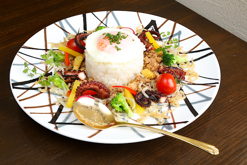 タコを粗めにカットしているためコリコリと食感がよく、噛むほどに旨みを感じられます。さらに市内の横須賀養鶏所のおれんじ卵を使った目玉焼きと、ニンニクオイルでカリッと炒めたシラスをトッピング。パクチーもたっぷり添えられ、エスニックな一皿に仕上がっています。