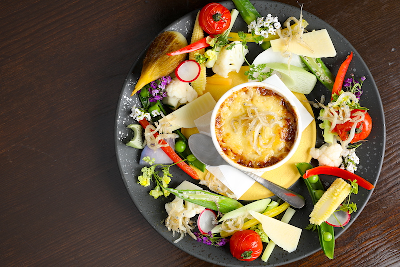 芸術作品のようなバーニャカウダ1000円(要予約)。自慢の温野菜は、トマトやオクラ、タケノコなど季節替わりの旬野菜をふんだんに。かわいらしいハーブの花をあしらっていますが、もちろんこちらも食べられます♪ディップソースはオイルにシラスや野菜ペーストを加え、上部にチーズをのせて焼き上げてできあがり。アツアツのソースを付けていただきましょう。