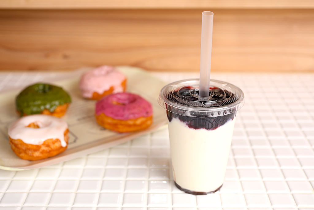 ドーナツと一緒に注文したい、干し芋シェイク550円。刻んだ干し芋に牛乳を加え、砂糖を加えてとろみが出るまでコトコト煮込み、ブレンダーでミックスしています。カップの底にはチョコレートを敷き、シェイクの上部にはブルーベリーの実から作ったゼリーをトッピング。ゼリーにはゼラチンではなく海藻からできたアガーを使うなど、ナチュラル素材にこだわり、体にやさしい干し芋シェイクが完成しました。