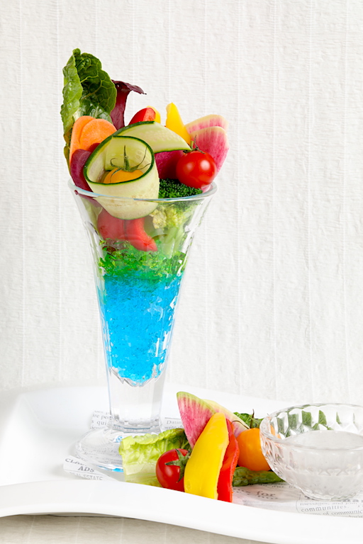 ゼリーの上には茨城県常陸太田市の栗原農園で栽培されたものなど8〜9種類の野菜が盛られています。ハート形の大根が隠れているなど、野菜の食感や甘みを楽しめるように素材によってカットを変えているのも驚きです。シラスと生クリーム、ニンニク入りのコクのあるディップソースで召し上がれ。