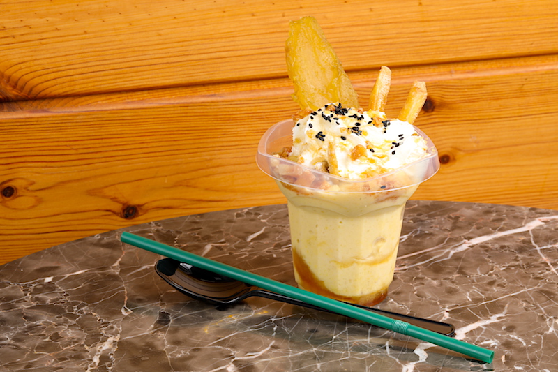 干し芋シェイク650円(予定)。カップの底にはサツマイモから抽出された芋蜜を敷き、日によって替わるお芋ジェラートをベースにオーツミルクと冷凍焼き芋をミックス。シェイクの中には砕いた芋けんぴを加え、シャリシャリッとした食感がアクセントになっています。生クリームと干し芋、芋けんぴがトッピングされ、お芋にはこんなにも多彩な食感と味わいがあるのかと驚かされます。