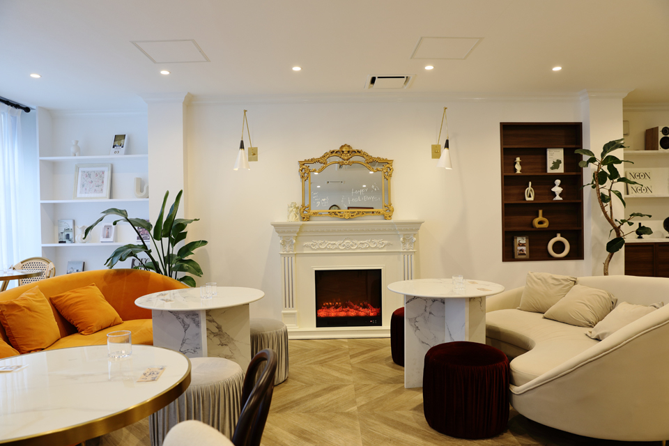 「フランスをイメージした優雅な非日常」をテーマにした店内は、白を基調とした欧風のエレガントな空間。暖炉風のインテリアが配され、オレンジのソファや調度品もおしゃれです。