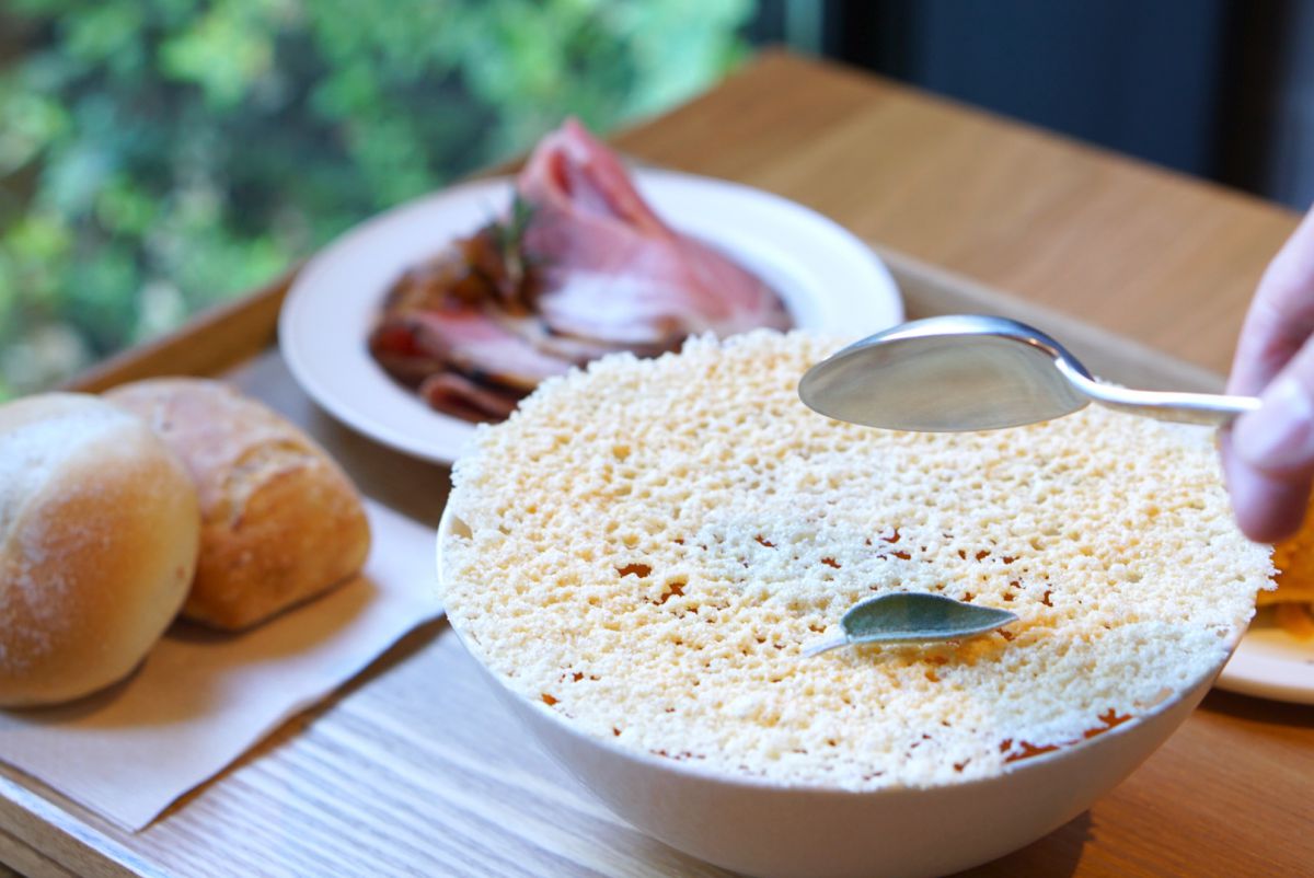 こちらのスープは、「NOUMUの濃厚ビスク」。パリパリに焼き上げたチーズが薄いフタのようになっていて、写真映えする一杯です。チーズの中心をスプーンで割ることで、濃厚なビスクの鮮やかな赤色と濃厚な香りが広がるという五感で楽しめる仕掛けが盛り込まれています。