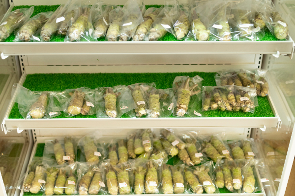 店頭には、契約先の地元農家さんから卸している新鮮なわさびが並びます。意外と手に取りやすい価格ですが、丸々一本を買ってもいかしきれない気がする…。