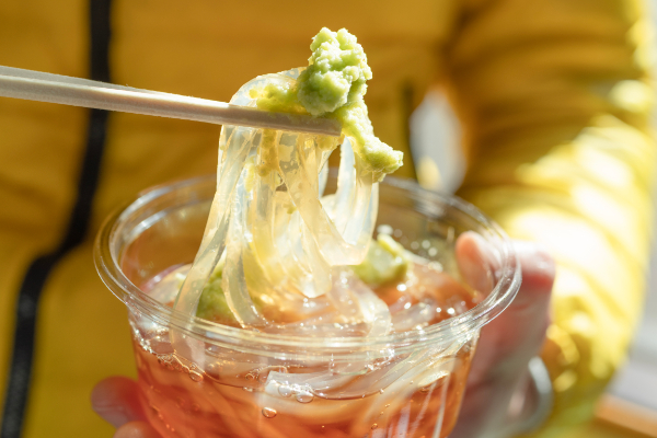 が、わさびの辛さを侮るなかれ!ところてんとわさびをしっかりと馴染ませてから食べることが、辛さを和らげるポイントです。