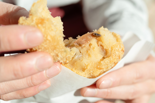 サクサクのコロッケを頬張ると、甘辛の味付けが食欲をそそる!