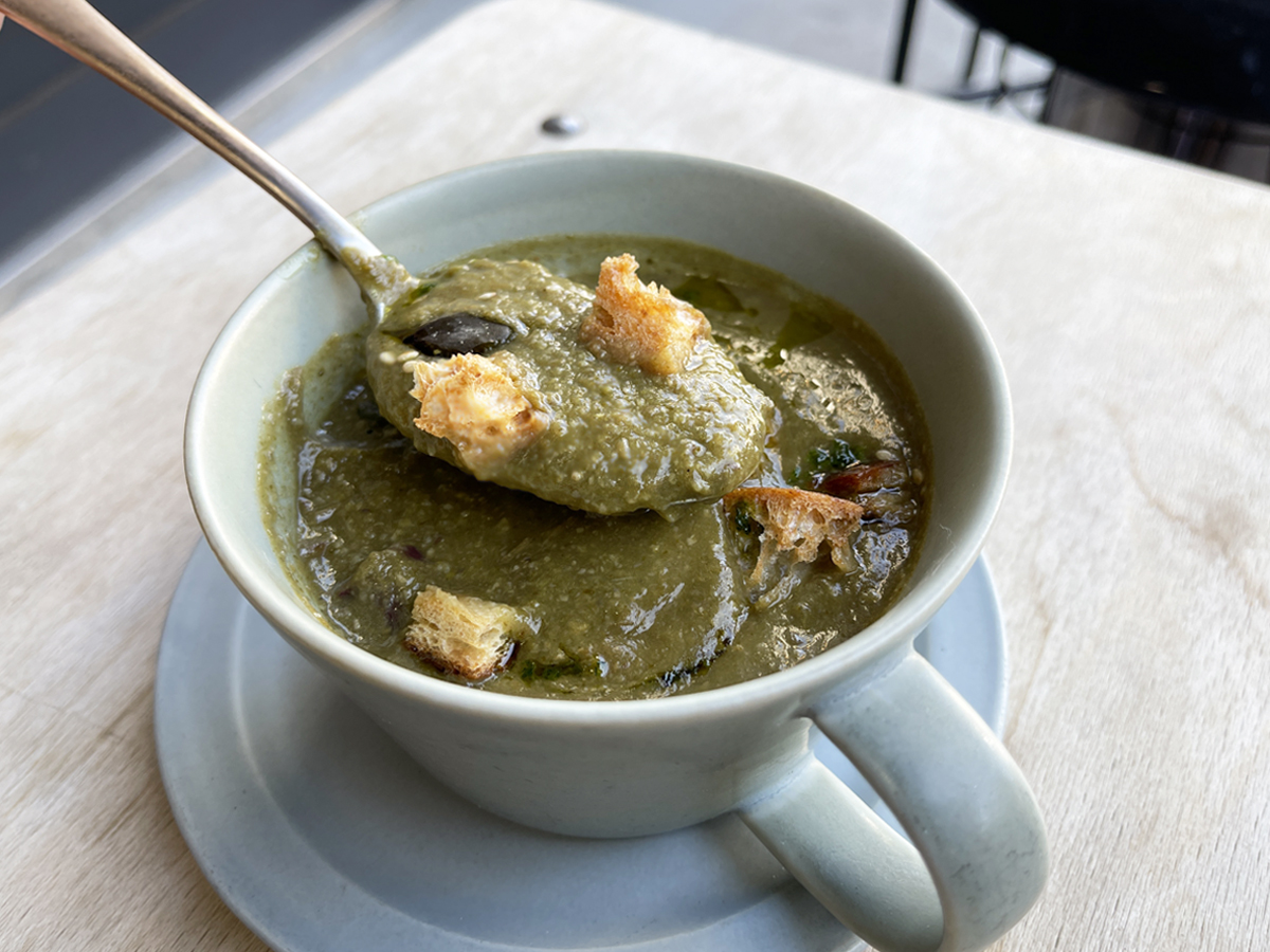 この日の「本日のスープ」は、ブロッコリーやズッキーニ、ホウレンソウなど緑の野菜を煮込んだスープ。バターや肉類は使わず、オリーブオイルでコクを出しています。とってもマイルド。