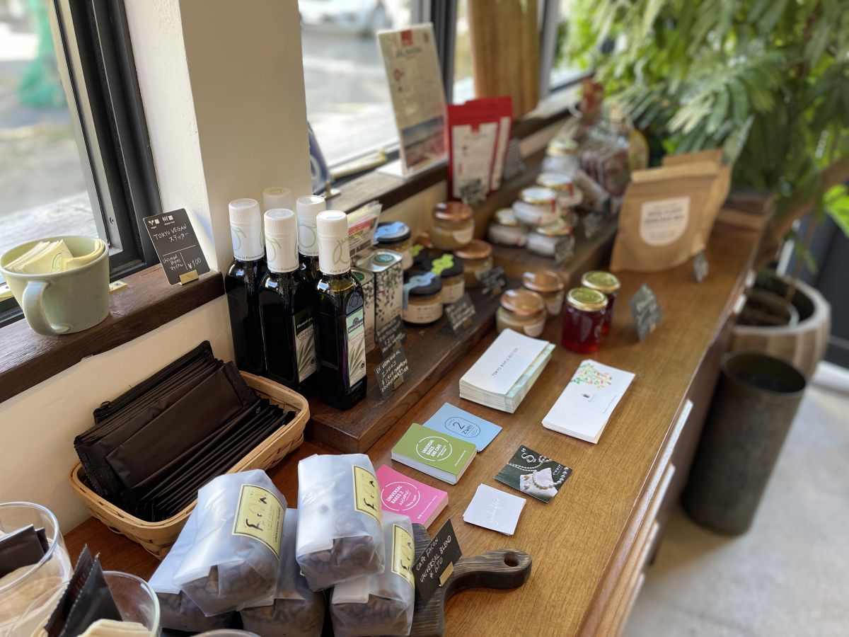 「カフェ・ファソン」のコーヒー豆や、スープに使用しているオリーブオイル、ジャムやピーナッツバターなど、食べる人のことを想い、素材や手作りにこだわったものばかり。帰りの際にぜひ覗いてみてくださいね。
