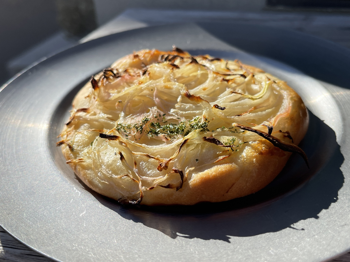 スープのおともにおすすめのパンは、自家製サワークリームの上にタマネギをのせて焼く「サワークリームオニオン」。タマネギは豆乳ベースの米酢に漬け、甘みを増しています。シャキシャキ食感も感じられ、焼き加減も絶妙!