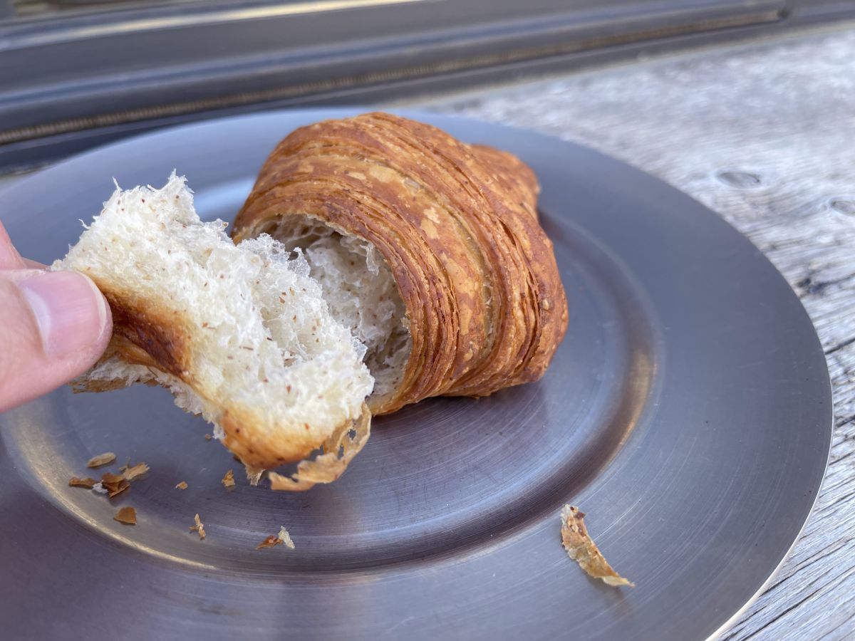 もうひとつは「クロワッサン」。表面はパリッと、中は程よい小麦生地の弾力を感じます。植物性のバターにマカダミアナッツやアーモンドを加えて、香ばしさや味わい深さを出しているんだそう。