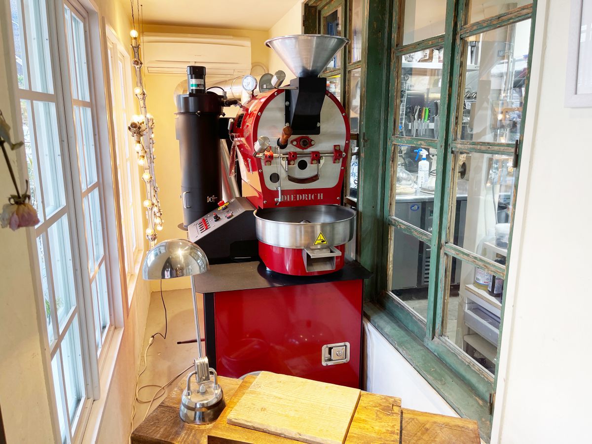 1階の入り口付近にはアメリカの焙煎機「ディードリッヒ」が。店内で提供されるコーヒーはすべて、この焙煎機で焙煎されているのだとか。