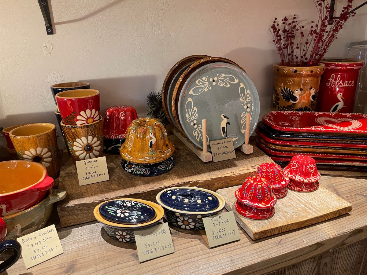 また、アルザスの伝統工芸の陶器「スフレンハイム焼き」も販売中。絵柄のモチーフは、アルザス地方で幸せのシンボルとされているコウノトリやデイジーの花、ハート模様など。ひとつひとつ職人さんが手作業で絵付けしており、ぽってりとした厚みと素朴な雰囲気で、ファンも多いそう。