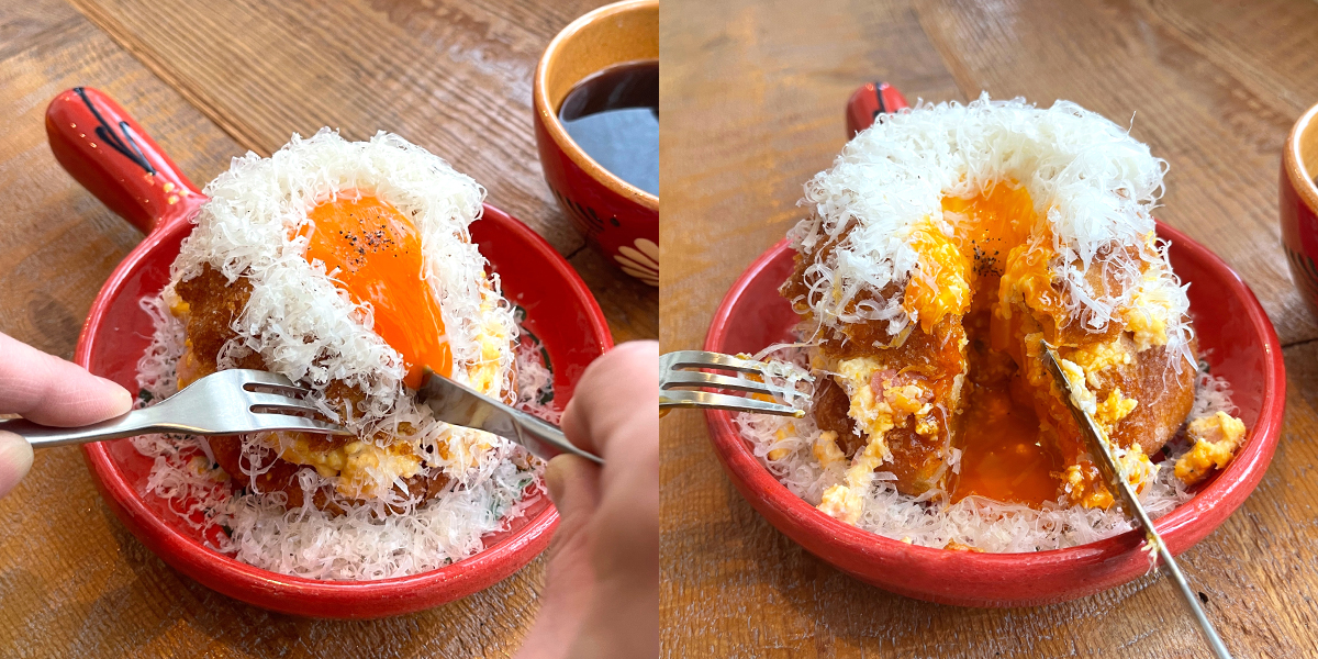 焼きたてのアツアツふわふわクグロフに、カルボナーラ風のベーコン入りスクランブルエッグをたっぷりとサンドして、すりおろしたパルメザンチーズと卵黄をトッピングした贅沢仕上げ。