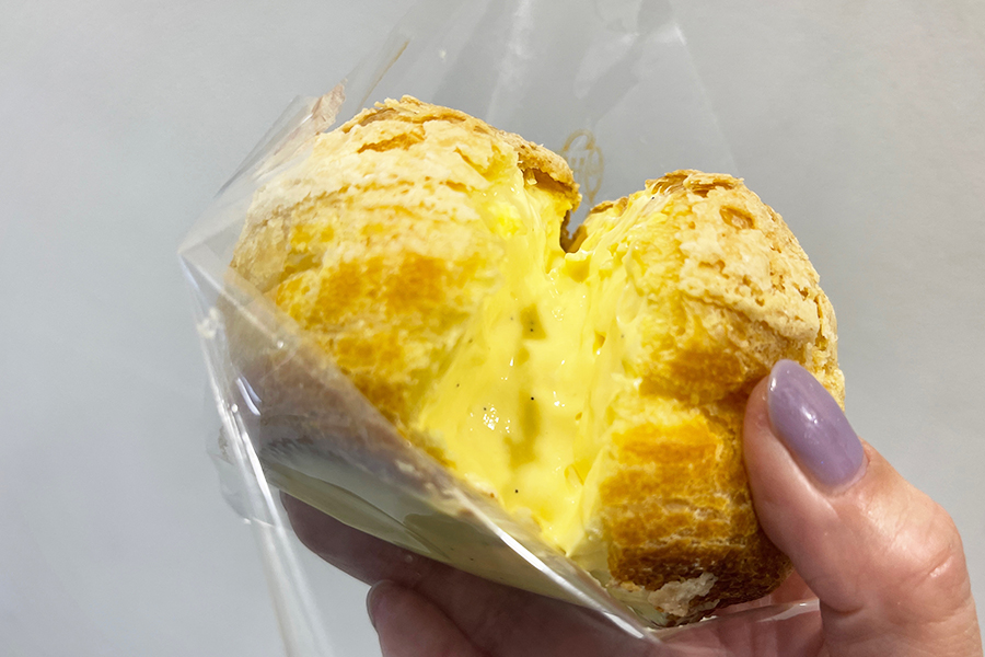 クッキー生地をのせて焼き上げたシュー生地に、これまたブランド卵「つまんでご卵」をふんだんに使用したカスタードクリームを、注文後にその場で詰めて提供してくれます。