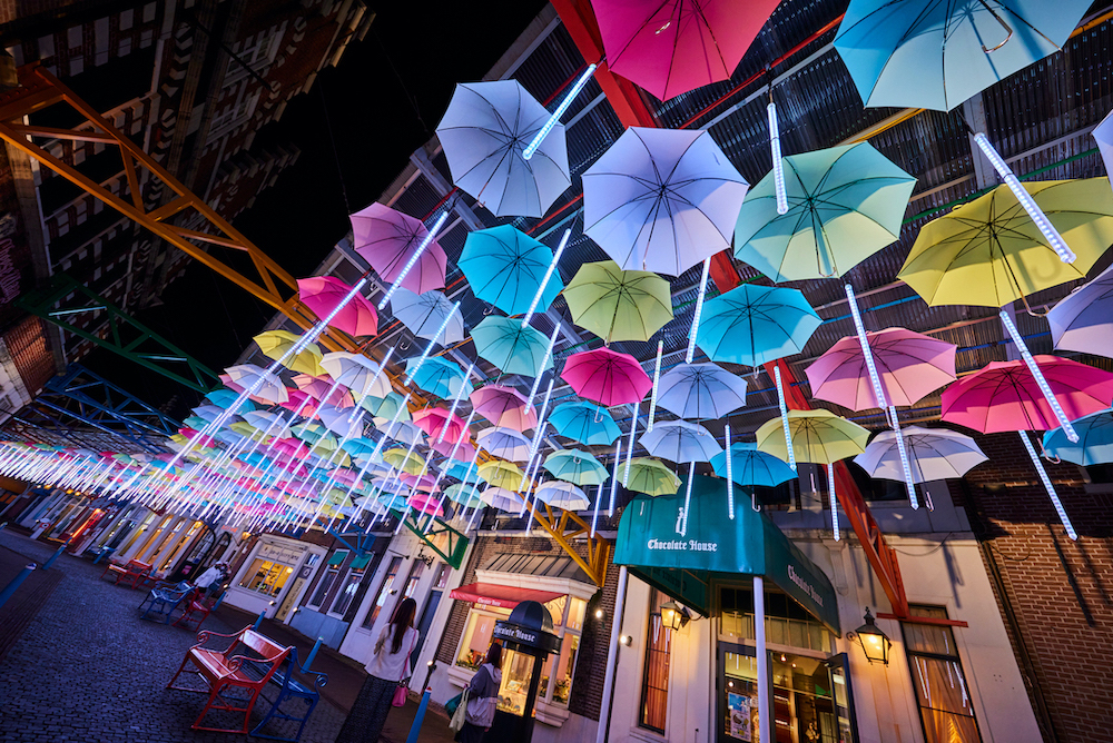 日が暮れるにつれ、ハウステンボスはイルミネーションの光が満ちるロマンティックな世界へと変貌をとげます。ハウステンボスでは場内どこにいても美しく輝くイルミネーションを楽しめるので、夜の街のお散歩もとっても楽しい!なかでもアトラクションタウンにある「アンブレラストリート」は、約700本もの傘と光が彩る人気のフォトスポット。春バージョンの光の演出に心が躍ります。