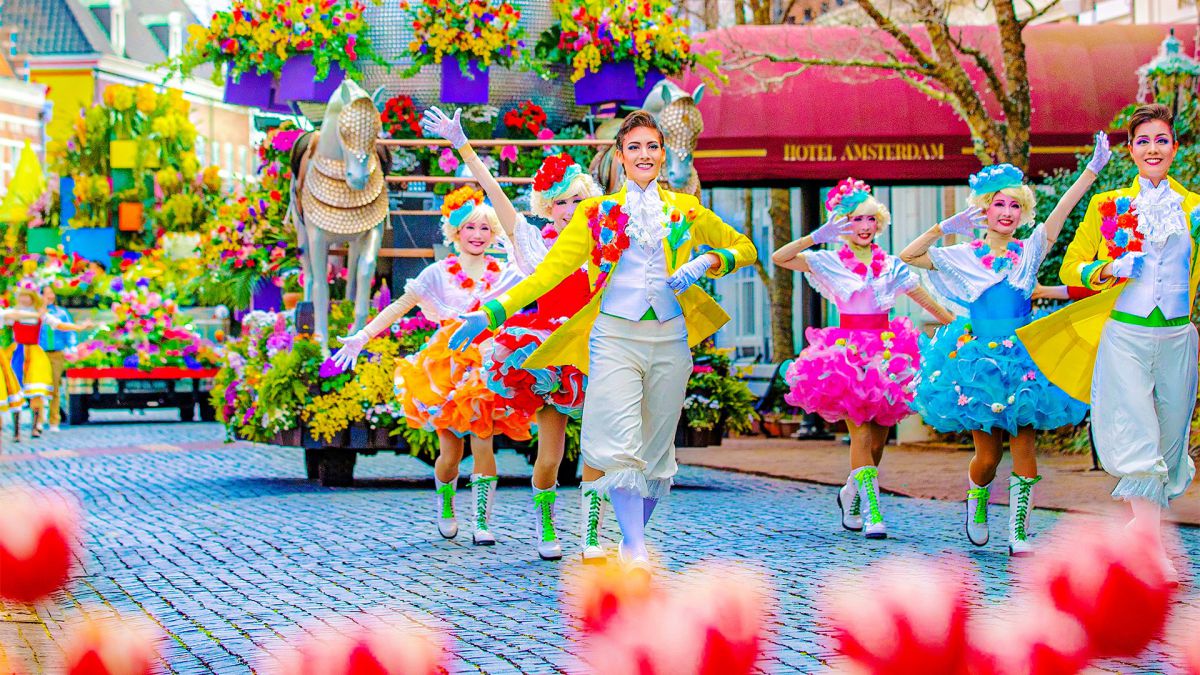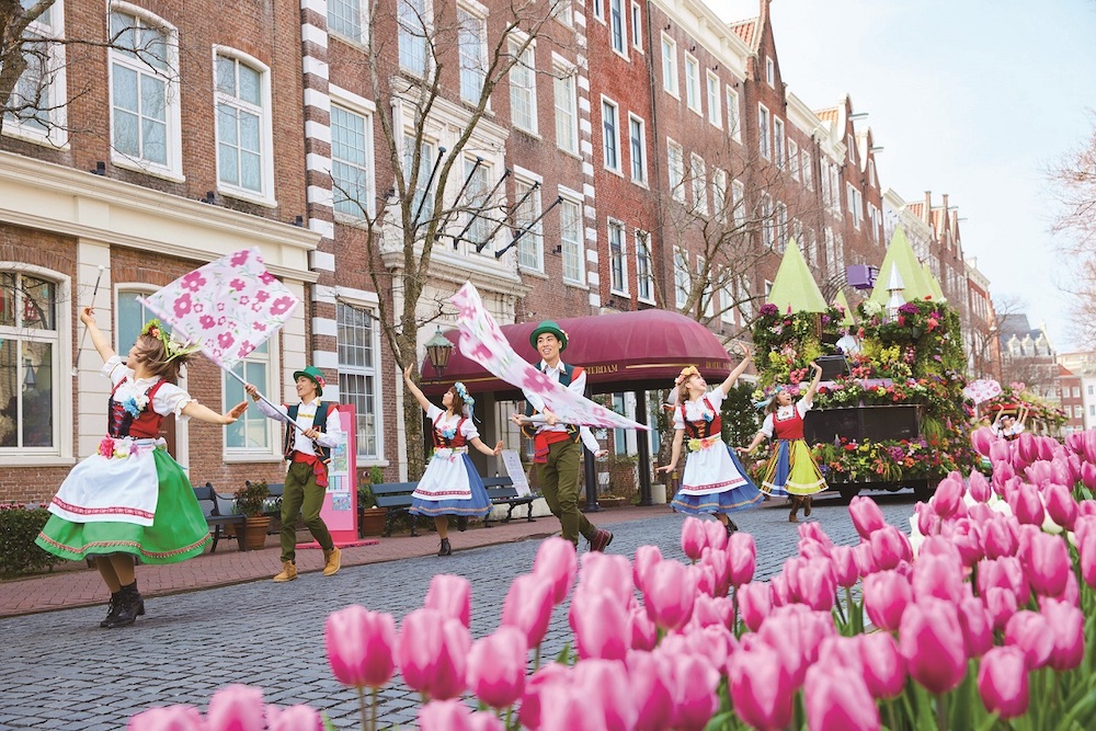午後は、祝祭ムードたっぷりのにぎやかなショーやパレードも見逃せません。アトラクションタウンからアムステルダム広場へと移動する「フラワーパレード」では、色とりどりの生花があしらわれたフロートやキャスト、マスコットキャラクターのちゅーりーが場内を巡ります。