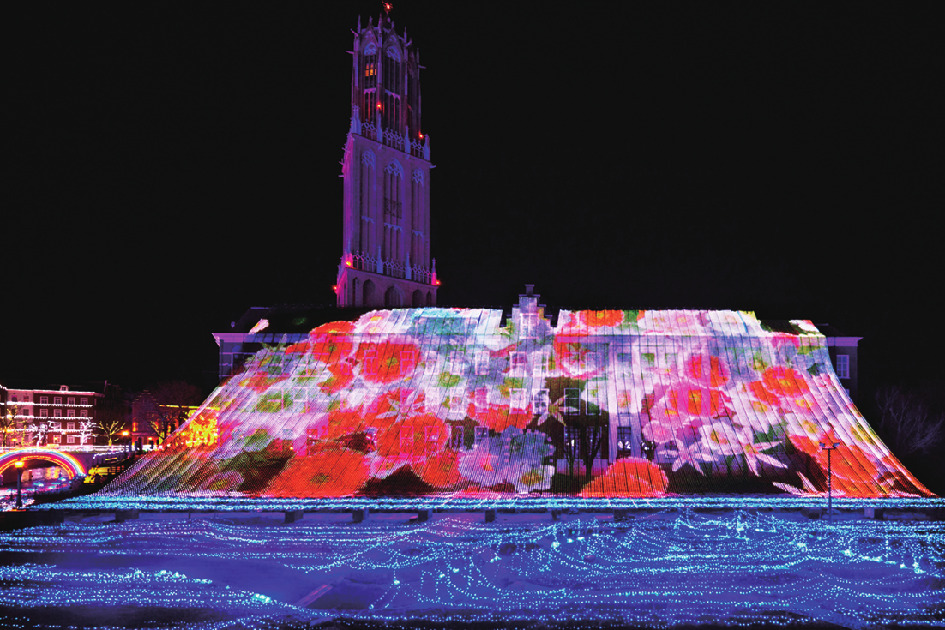 アートガーデンでは、幅66mの広大な「光の滝」が織りなす幻想的なショーに注目。背後にそびえる高さ105mのハウステンボスのシンボルタワー・ドムトールンとあわせて、美しい1枚を撮影してみて。