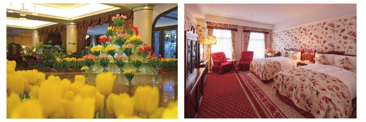 四季折々の花々で彩られるロビーホールは、「ホテルヨーロッパ」のおもてなしのひとつ。春の季節は、美しいチューリップやカーネーションなどが咲き誇り、ゲストを温かく迎えてくれます。また、お花をテーマにコーディネートされた「フラワールーム」も人気です。洗練されたヨーロッパ調のデザインの客室が華やかに彩られ、客室にいる間も幸せな気分に浸れそう。ラウンジでは、本格スイーツを味わいながら優雅なティータイムを過ごせます。