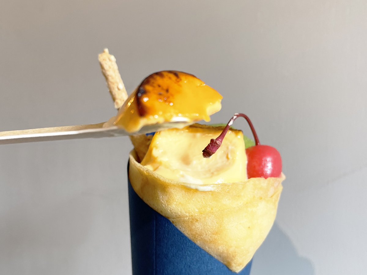 プリンの下にはカスタードクリームと生クリームを混ぜたディプロマットクリームが、クレープの底までぎっしり。見た目は小ぶりですが、とってもボリューミーなクレープです。