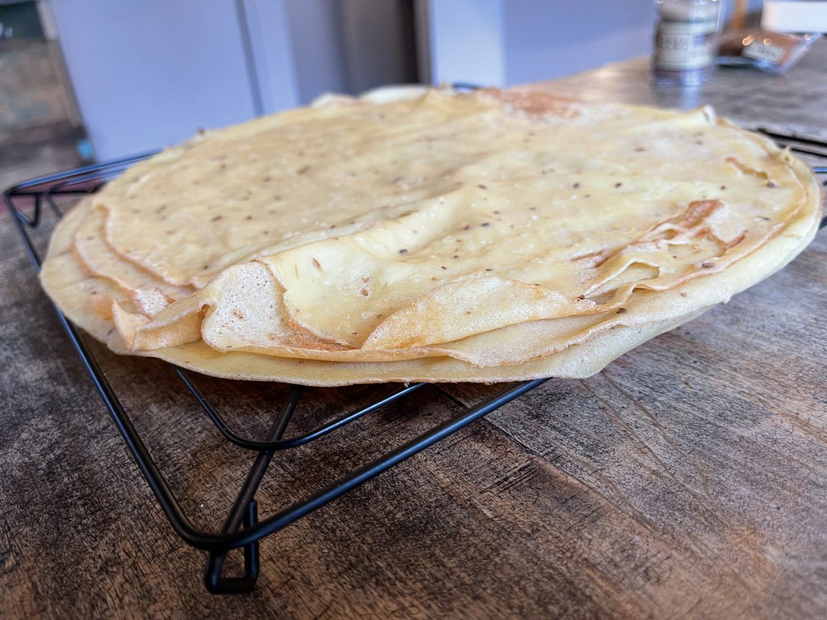 スイーツ系のクレープ生地とは違い、おかずラップの生地にはビールの原料のひとつである麦芽のカスを混ぜて焼いているんだとか。