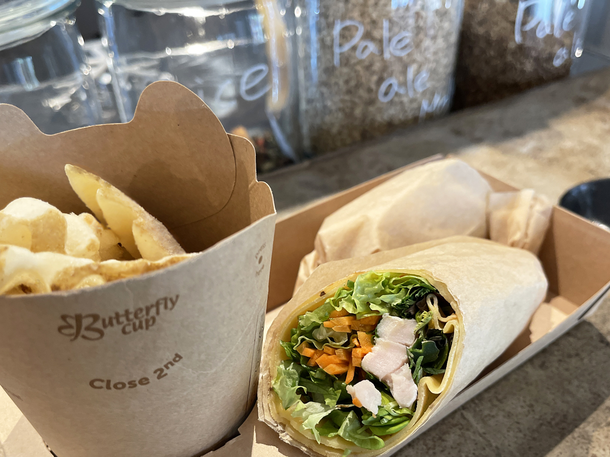 「ほろほろ鳥のささみハムとワイルドリーフサラダ クラップ」は、岩手県の石黒農場で育てられたほろほろ鳥の自家製ハムと、人参などの野菜とハーブなどの具だくさんなラップです。