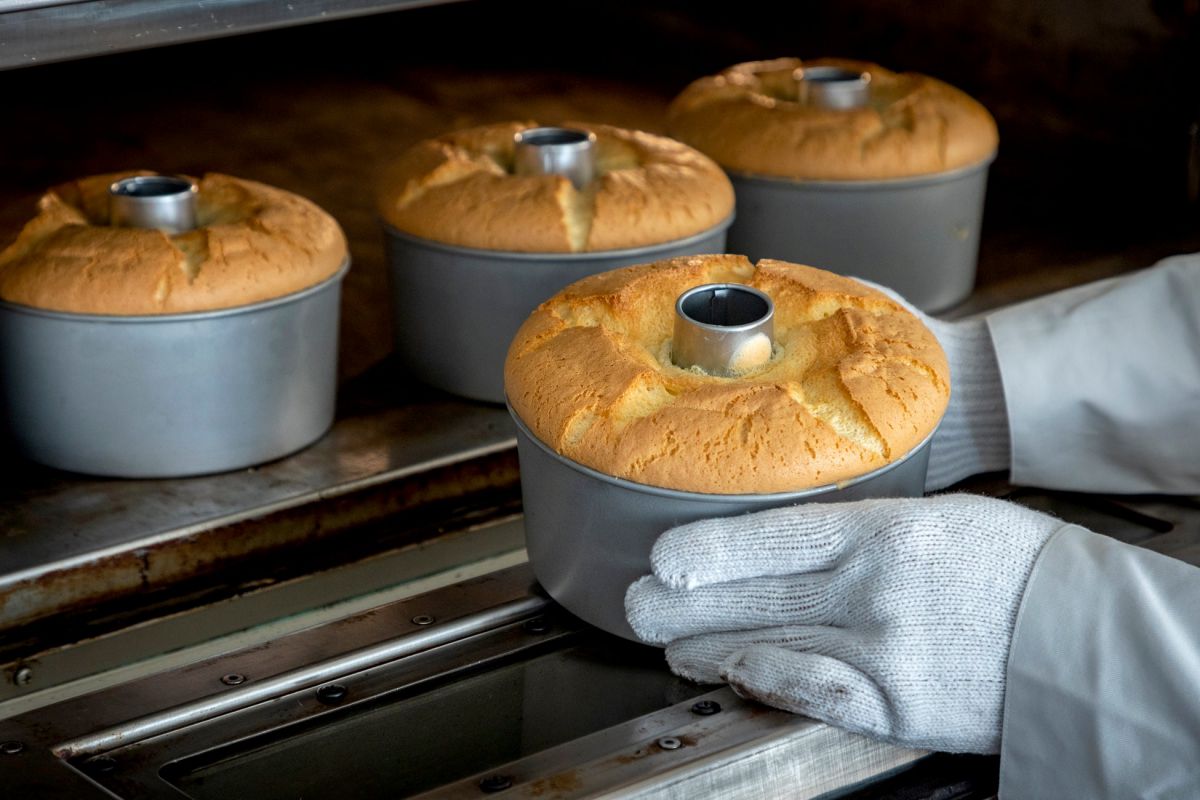 「J.DEUX CERCLE」のシフォンケーキは生地作りが命。メレンゲの立て方で生地は変わり、小麦粉の合わせ方で食感や味が決まります。プロの技術者が温度や湿度で生産方法を見極め、最高級のシフォンケーキを生み出します。