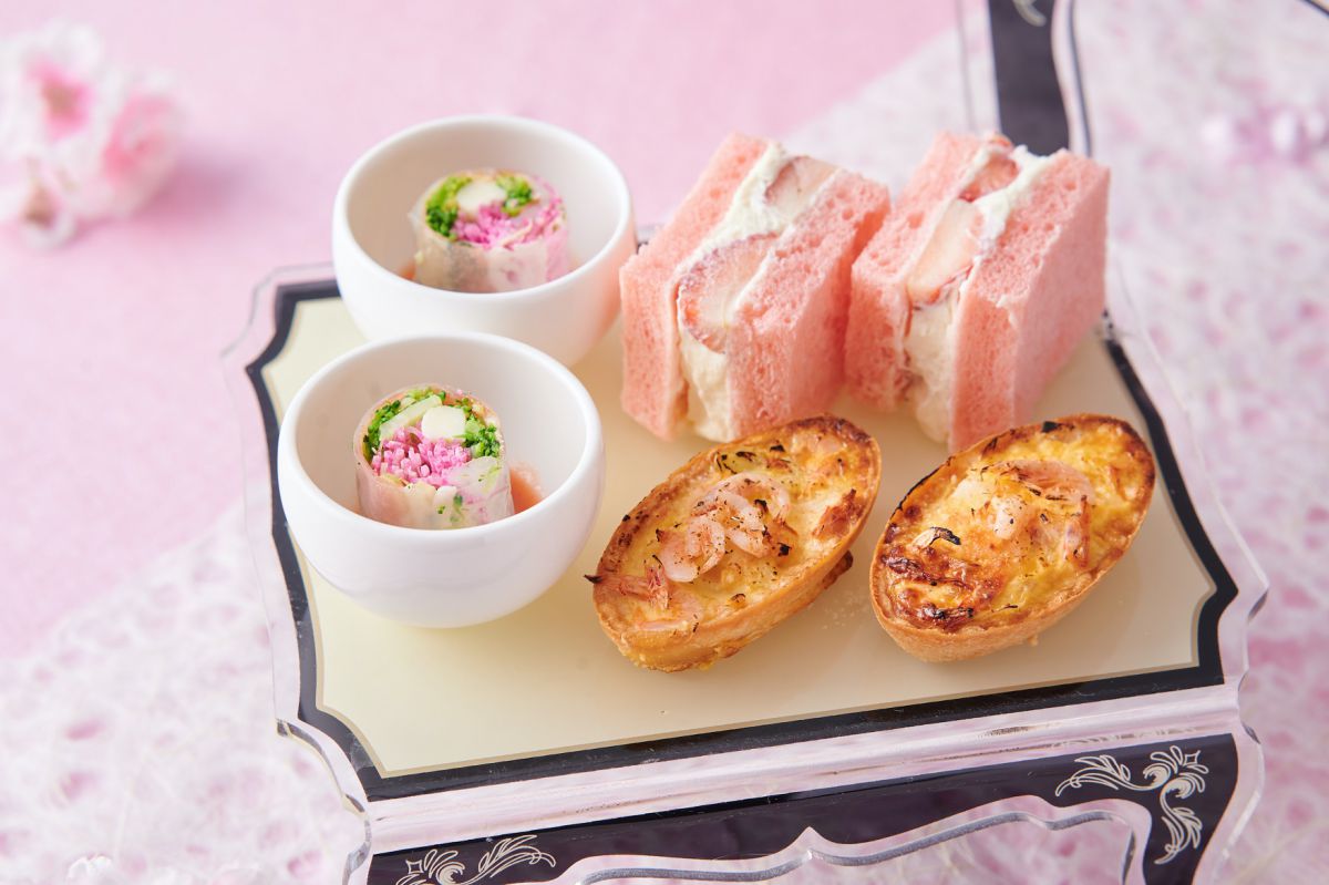 セイボリーもピンクの「いちごサンド マスカルポーネ」や「桜エビと春キャベツのキッシュ」、「ブロッコリーとハモンセラーノの生春巻き」と、春らしいメニューが楽しめます。