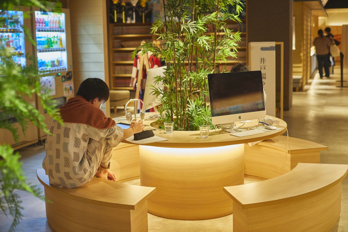 ネットカフェ的に使えるのが「井戸端ラウンジ」。パソコンやUSBポートなどが用意されていて、無料Wi-Fiも完備。