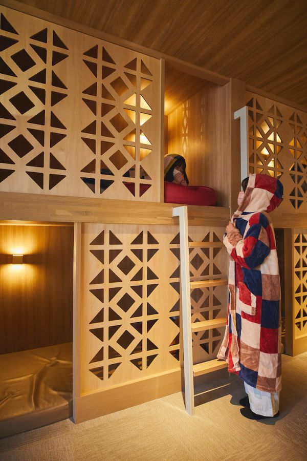 アメニティも気が利いていて、たとえば男女別に色違いで用意されている「着る毛布」。一枚羽織ればぬくぬくと、好きなスペースでごろごろできます。