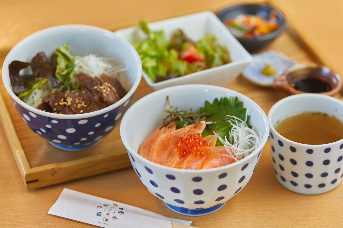 目玉商品は7種類のミニ丼のなかから2つ選べる「マイ小丼セット」。ラインナップは牛ハラミ焼き肉丼、鯛の胡麻ダレ丼、焼きチーズキーマカレー丼、牛ビビンバ丼など海鮮、肉、がっつり系などバラエティに富んでいるので、その日の気分で組み合わせて。