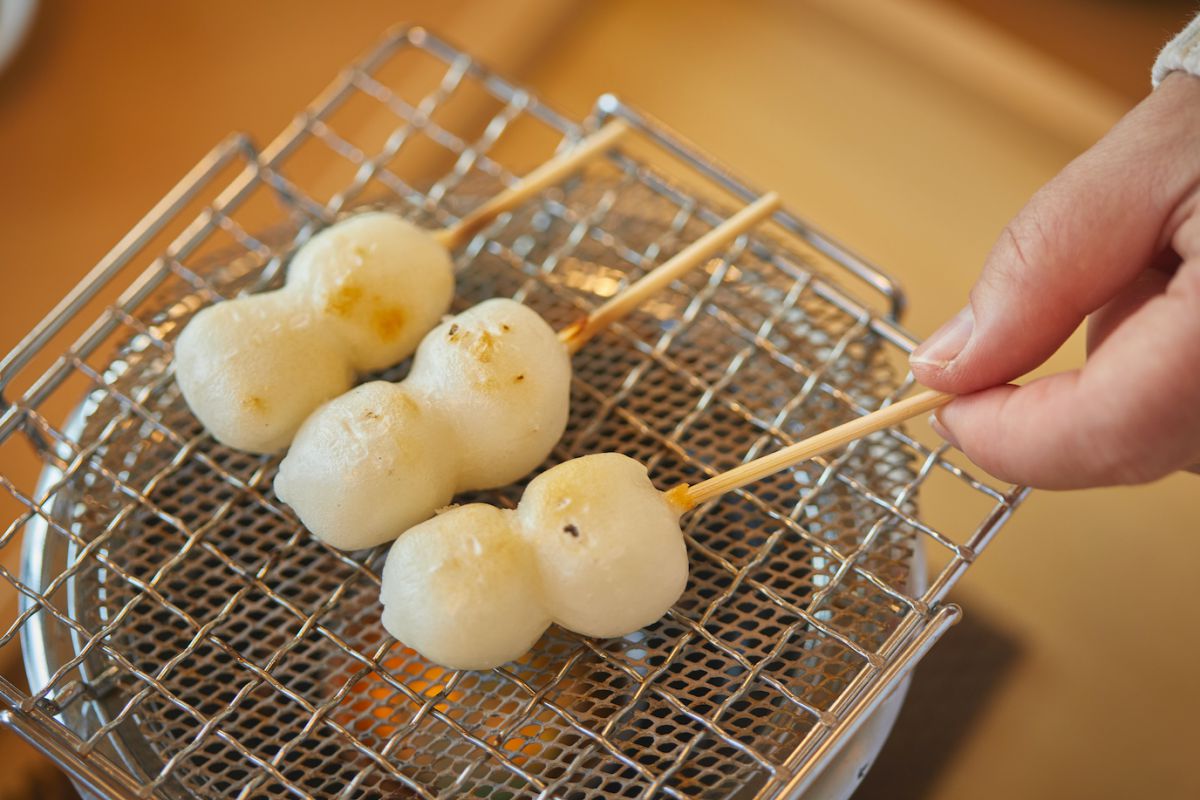 直火焼きでほんのりと焦げ目をつけて、砂糖抹茶、みたらしダレ、おろし醤油の3種類の味でいただきます。お米100%の団子はもちもちで噛むほどに甘みがあって、とっても美味。