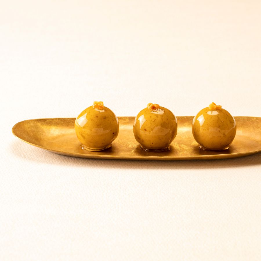 「まろん marron」の見た目は「亀屋良長」の代表銘菓「烏羽玉」にそっくりですが、国産栗を蒸して裏ごしし、生クリームとラム酒を加えた餡玉を、ラム酒入り寒天でコーティングするという洋菓子の手法を、和菓子の「烏羽玉」に落とし込むことにより生まれた新しいスイーツです。