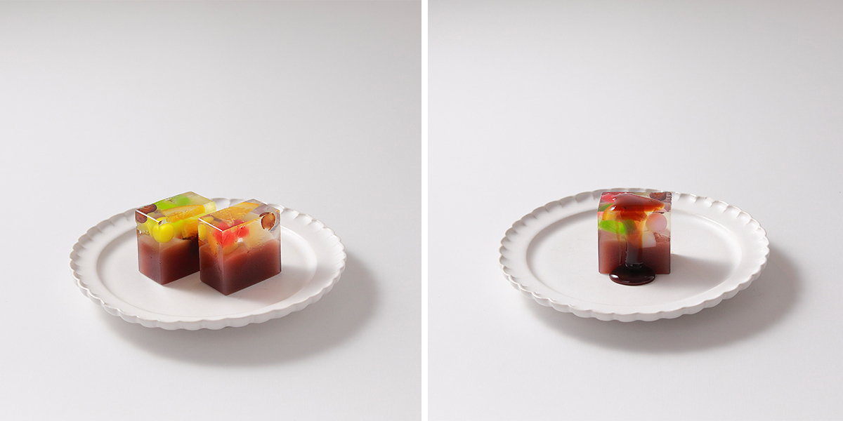 しかし、あんみつのキラキラ感が伝わったらもっと多くの人にあんみつのよさが届くんじゃないか、そんなふうに思っていたときに出会ったのがこの「あんみつ」でした。切るたびに異なる表情、食感が楽しめるあんみつです。