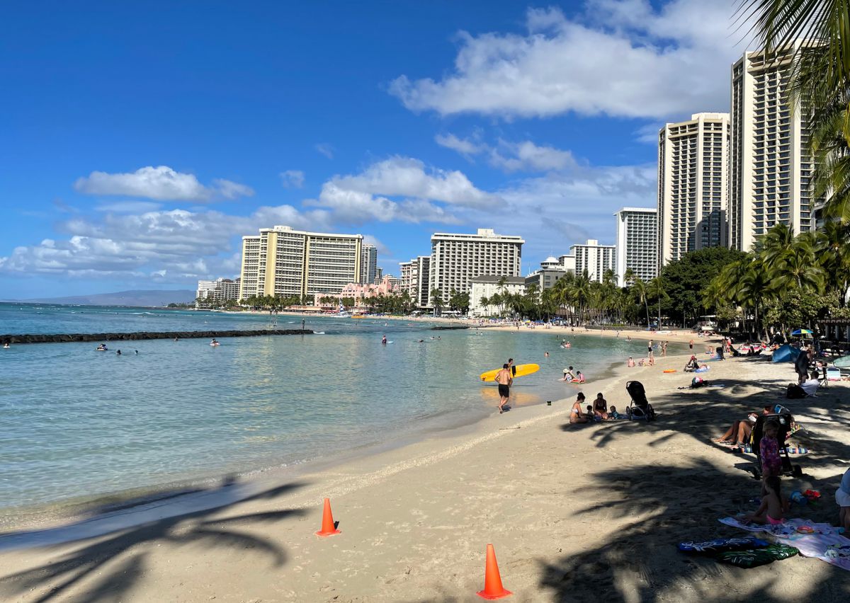 腹ごしらえをしてひと息ついたら、まずは世界中の人が愛する有名なビーチ「ワイキキビーチ」へ。日光浴をする人や、目の覚めるような青い海と空を眺めているだけで心がほぐれて癒やされていきます。