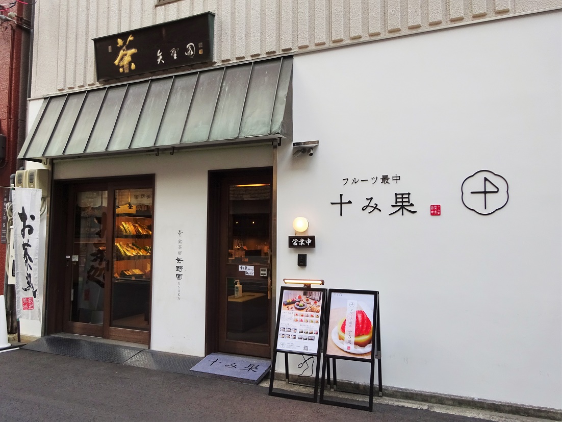 それがこちらの「フルーツ最中 十み果 新町店」。日本茶の老舗として知られる「お茶の矢野園」の店舗の一角を利用した、いわゆる“間借り”スタイル。右側のドアから入って、そのまま奥に進むと入店できます。