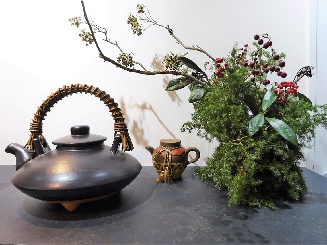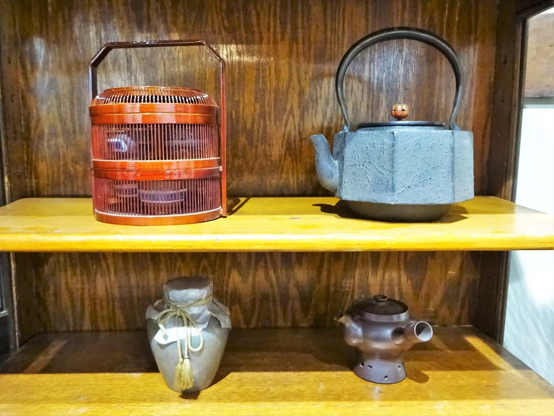 お茶屋の蔵を間借りしているだけあって、店内には古い茶器のディスプレイも。非日常的な空間の演出に一役買っています。フルーツ最中と合わせて「お茶の矢野園」で茶葉を一緒に買っていく人も多いのだとか。