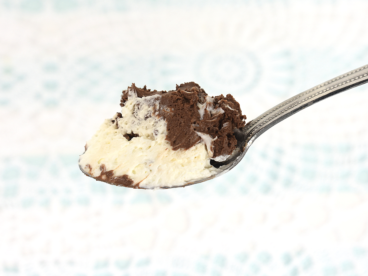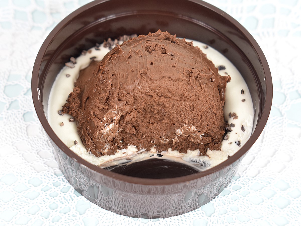 カップのふたを開けると、白いホイップクリームの上にこんもりと山のようなチョコムースが。クリームもカップいっぱいに詰まっているので、おやつとして十分なボリュームです。