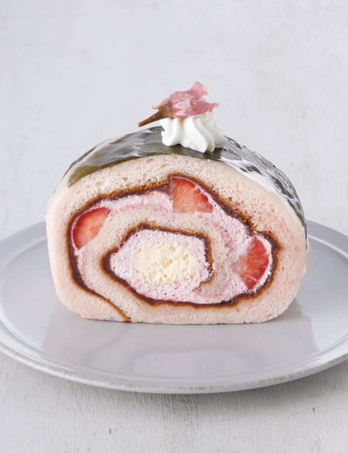 その見た目から想像できる通り、和菓子の桜餅から着想を得て作られたロールケーキだそう。塩漬けにされた桜の花と葉が春の訪れを感じる味わいに仕上がっています。