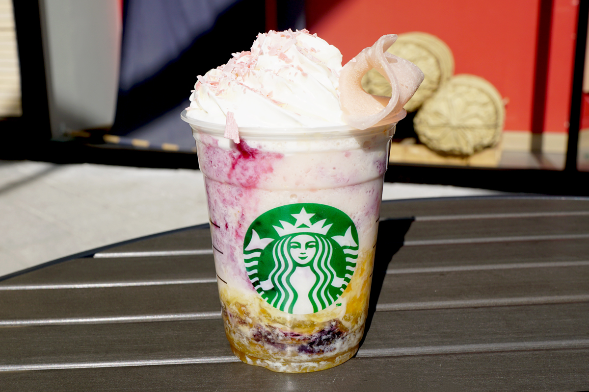 白玉や八ツ橋のもちもち食感が特徴的な桜いちご味のフラペチーノに、甘酸っぱいカシスソースがプラスされると…いったい、どんな味?