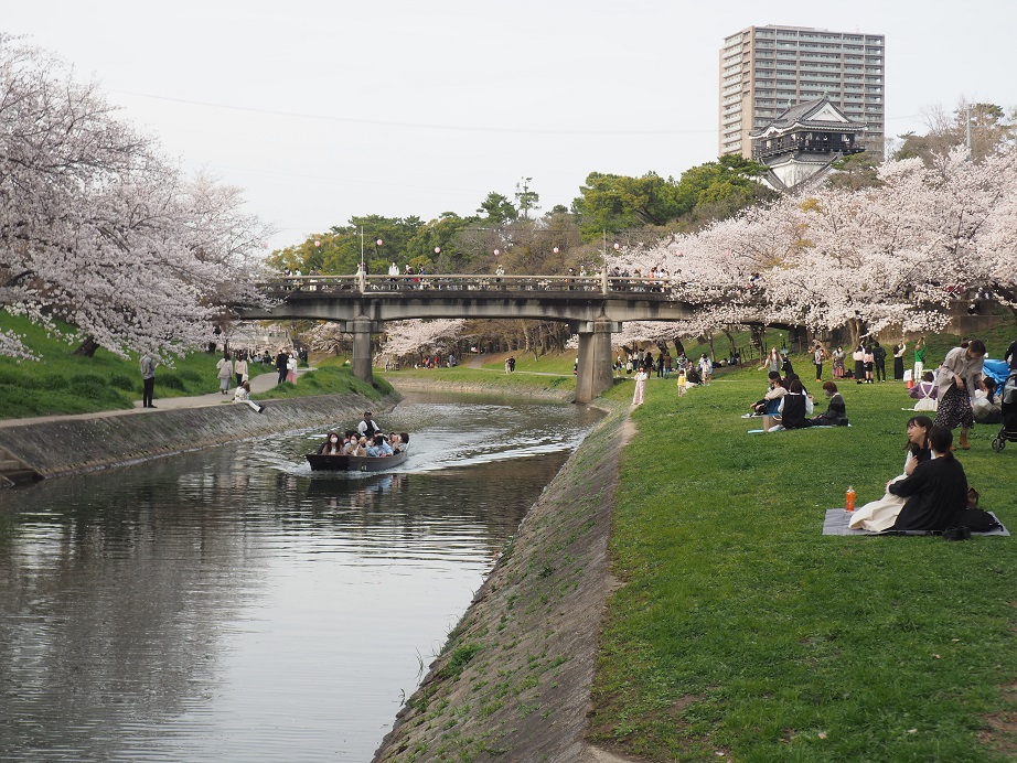 岡崎公園内だけでなく乙川・伊賀川の堤防沿いにも桜が連なり、岡崎市中心部の広域で花見を楽しめるのも魅力です。
