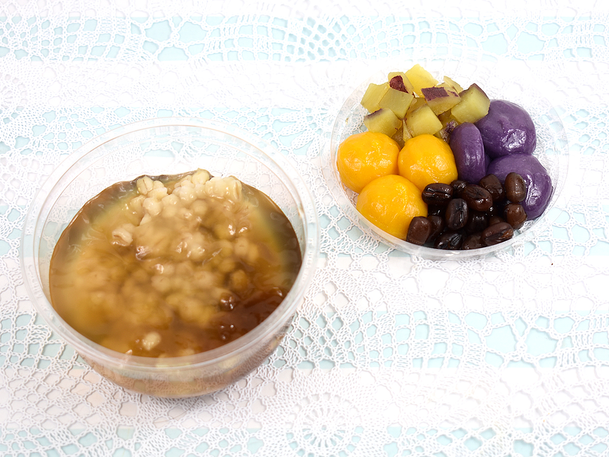 カップを開けると、紫芋団子・黄芋団子が3個ずつトッピングされています。鮮やかな色合いで存在感を主張し、まさにアジアンスイーツ!といった印象。芋団子を1つ口に運んでみると、食べる前は白玉をイメージしていましたが、その食感は想像を優に超えるほどツルツルでモチモチ。芋特有の風味も感じさせる上質な舌ざわりに驚きを隠せません。