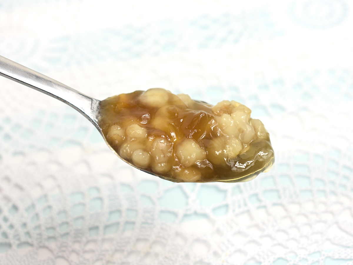ジュレをまとっていても、かのこ豆とサツマイモは歯ごたえのある食感がGOOD。噛めば噛むほど口の中いっぱいに甘みが広がり、芋団子に負けじとアピールしてきます。もちろん芋団子やかのこ豆とジュレの相性はばっちりで、黒糖シロップの優しくほんのりとした苦味が印象的。もち麦のプチプチ感も心地よく、味とともに素材ごとの食感も存分に堪能することができます。