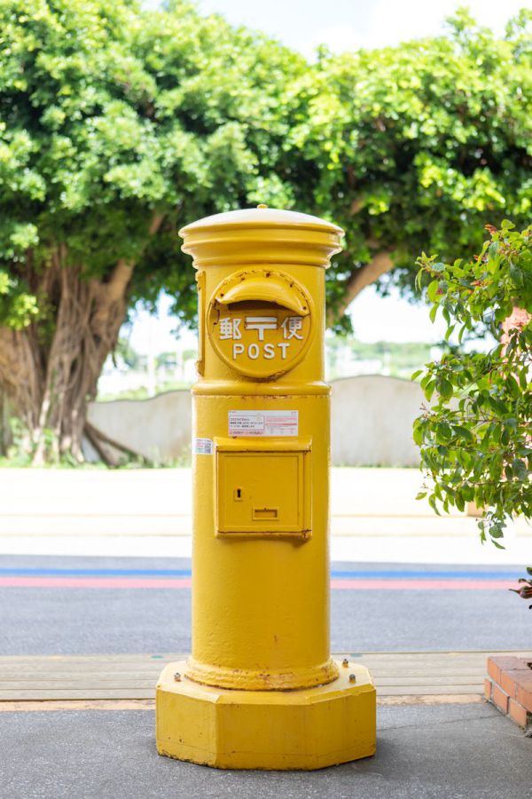 黄色く塗られたレトロな郵便ポスト。現役で活躍しているので手紙を出してみるのもおすすめ!