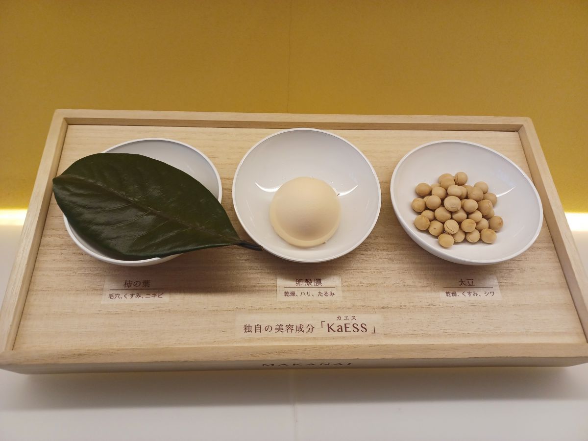 独自美容成分「KaESS」とは、金箔店をルーツにもつ「MAKANAI」だからこそ、120年以上の歴史の中で知り得た独自の成分。金箔に欠かせない箔打紙を仕込むために使われる“和のエキス”にヒントを得た、「柿の葉」や最近よく耳にする「卵殻膜」、「大豆」などが配合されています。