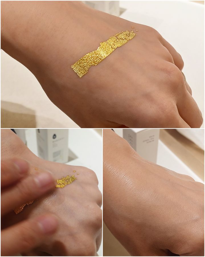 金箔が肌に吸い込まれていき、みるみるうちにハリとツヤ感が…! キラキラしていた金箔が、スーッと肌に消えていくのはとても不思議でした。