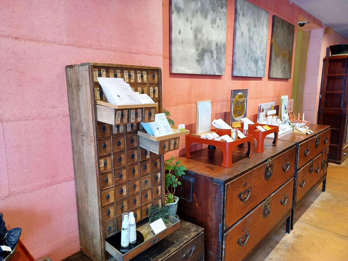 こちらはまたガラリと印象が異なるブース。商品のディスプレイに使われている棚がレトロでおしゃれ。古くてよいものを生かすことを大切にし、本物の骨董品が集められています。